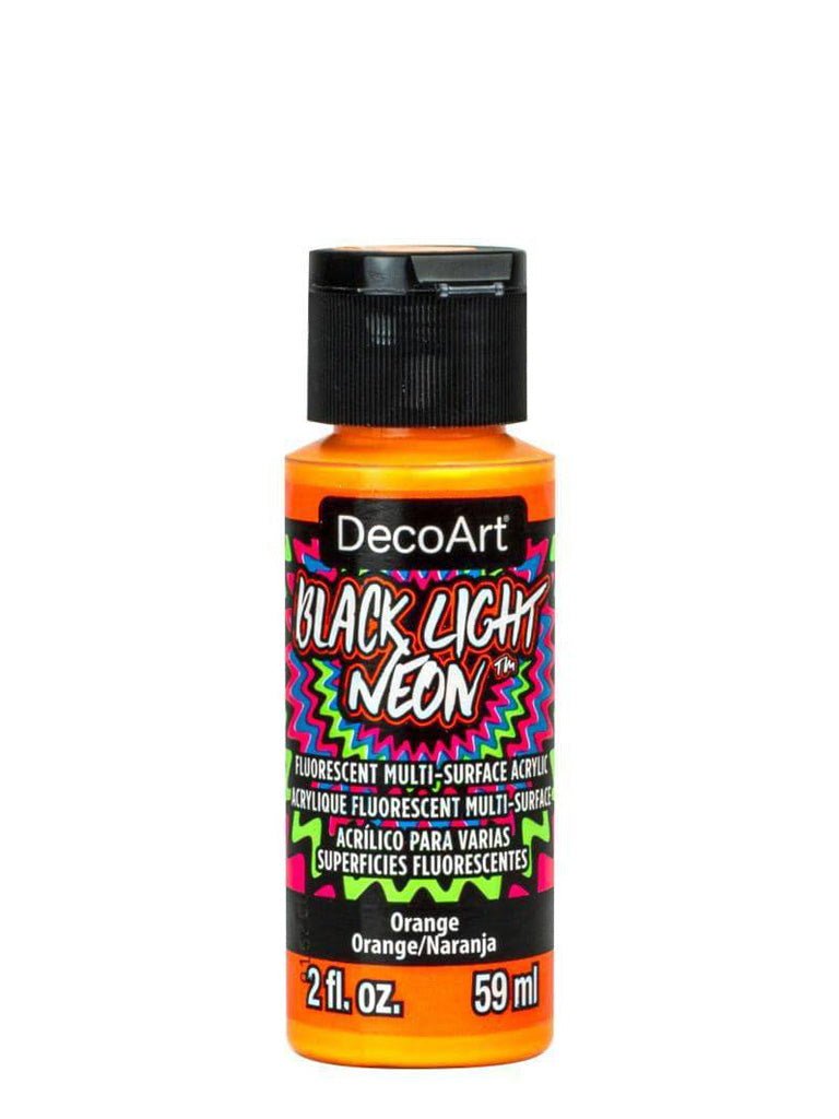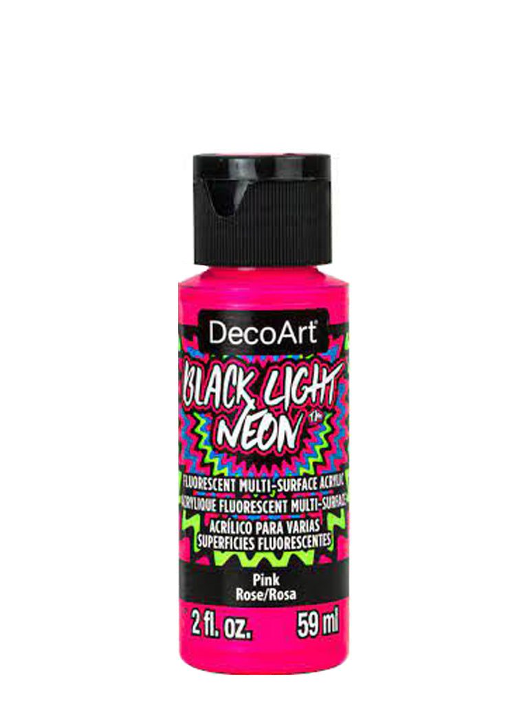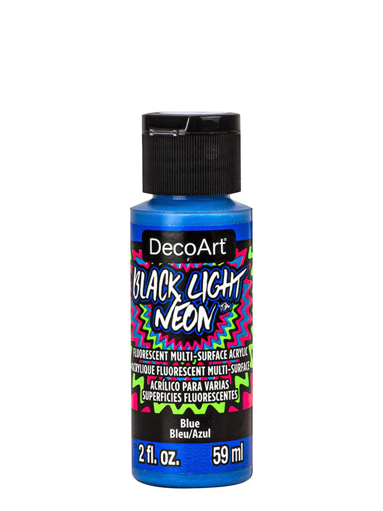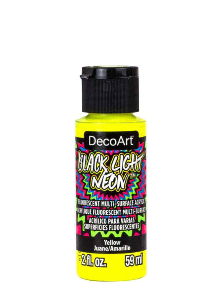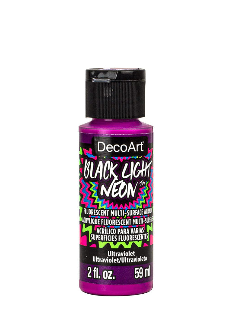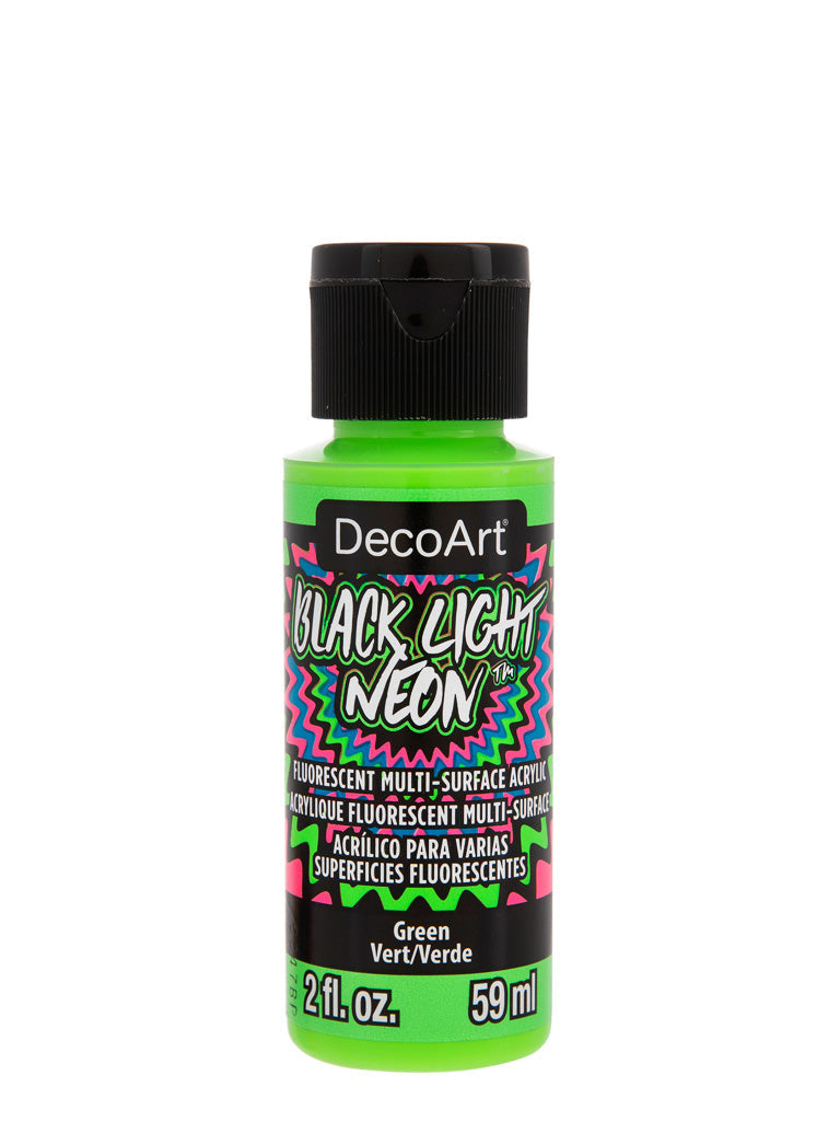 Electrify wearables, art and craft projects, and home decor with this intense neon paint! Utilizing fluorescent pigment technology, these psychedelic art and craft paints can be used on many surfaces and create vivid glow effects when viewed under a black light. These paints are suitable for indoor and outdoor use and are tested for excellence on wood, walls, canvas, metal, terra cotta, paper, ceramics, glass, styrofoam, most plastics, fabric, and masonry. For more opaque coverage, basecoat your surface with Americana Multi-Surface Acrylic paint.