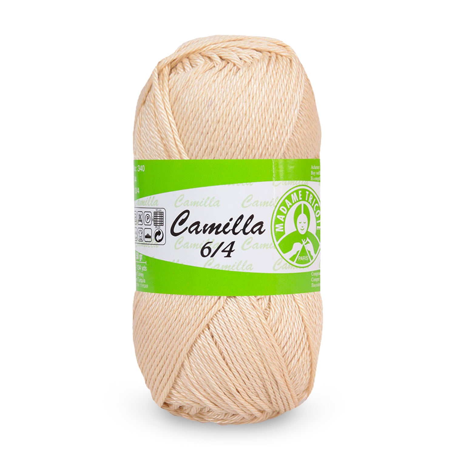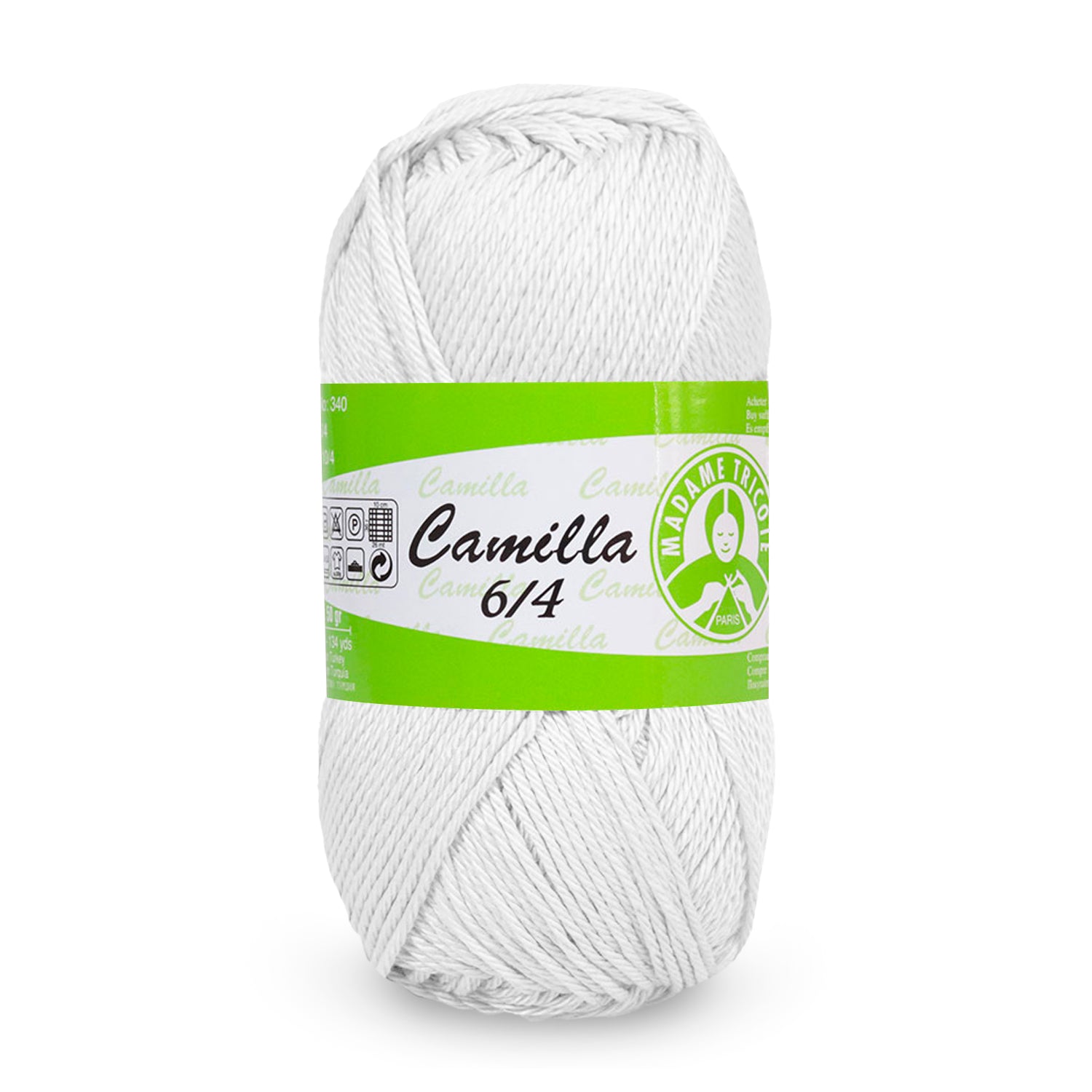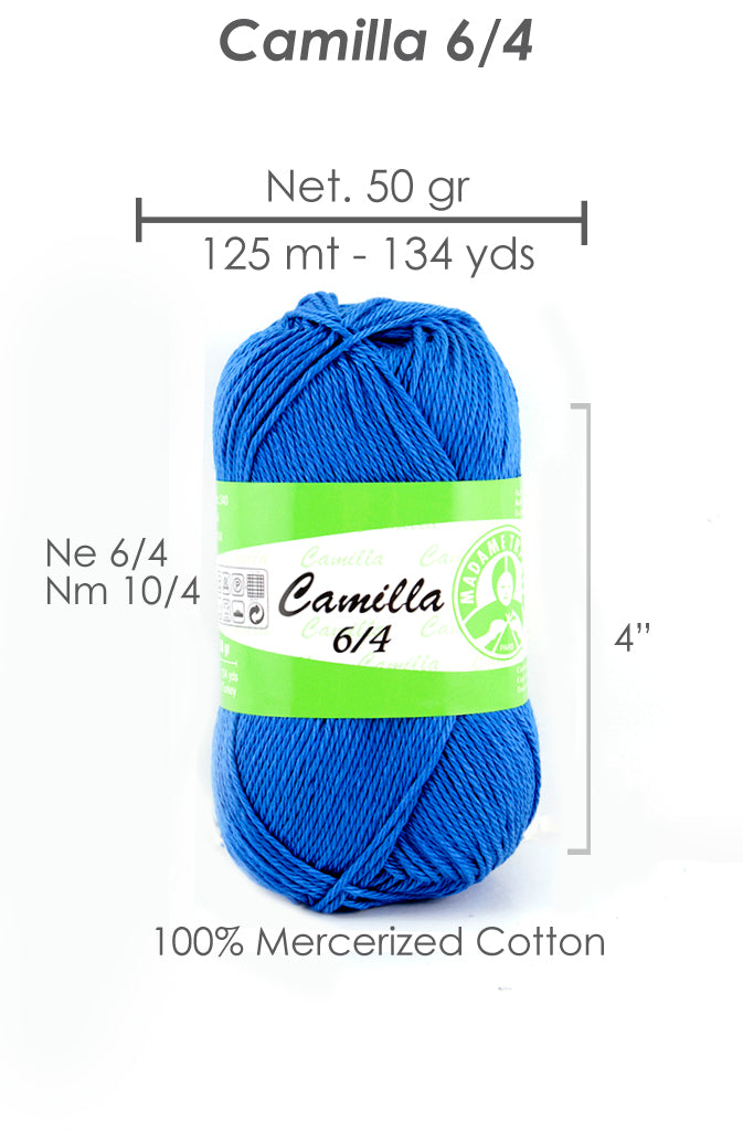 Brand : Madame Tricote Paris - Camilla 6/4NE: 6/4Colors: VarietyKnit Size: 2.5Crochet Size: 1, 75, 2Item Weight: 50gmMaterial: Cotton 100%Length: 125 Meters | 136 Yards Camilla yarn by Madame Tricote Paris is a 100% mercerized cotton yarn that is ideal for both knitting and crochet projects. The large color range and soft, sturdy build make the yarn a great choice for bags, shawls, toys, scarves and more.