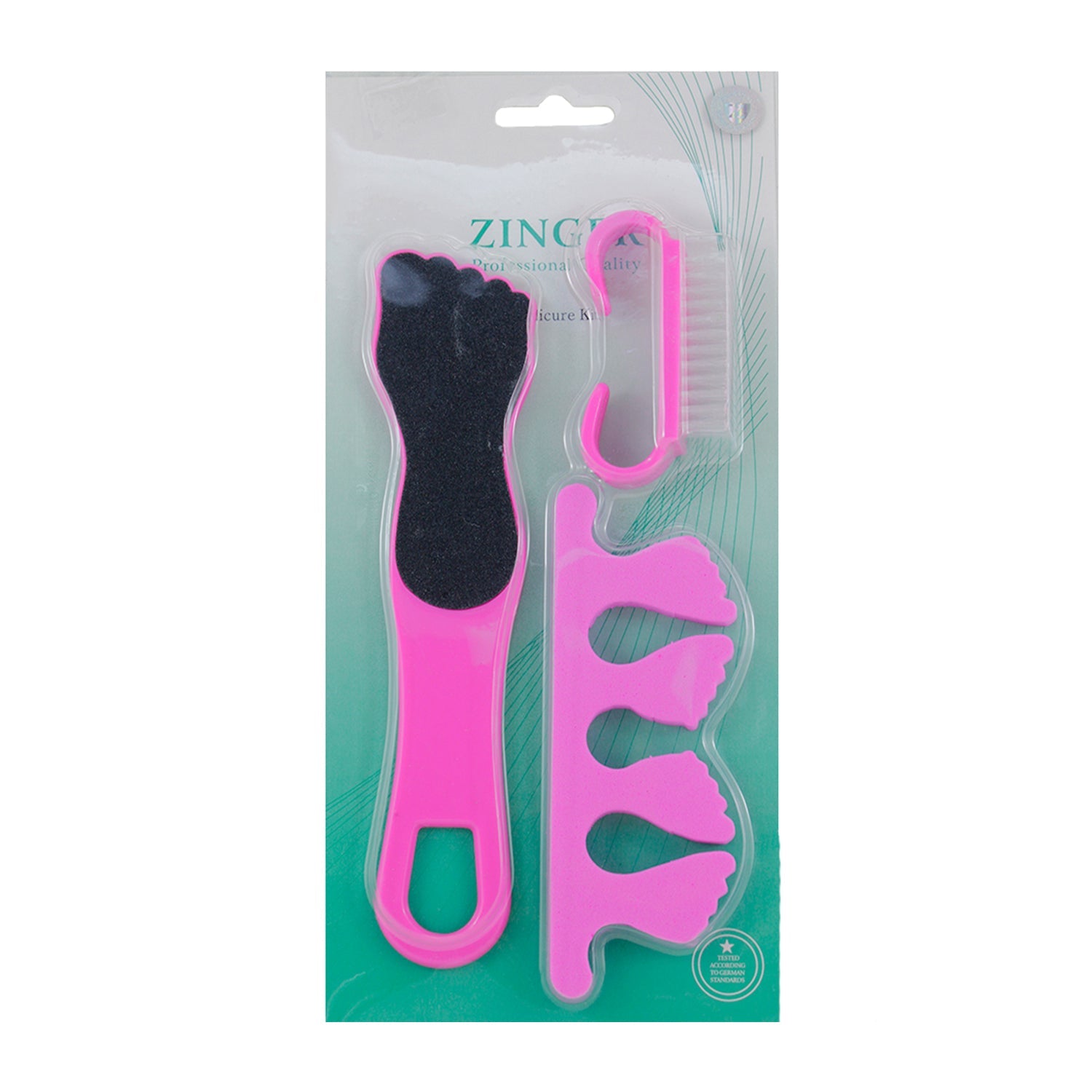 This pedicure care set includes 3 pcs: nail brush, toe separator and contour toe file. Provides everything you would need to keep your nails looking great.